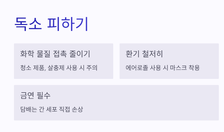 - 화학 물질 접촉 줄이기: 청소 제품, 살충제, 화학 물질 사용 시 주의하고, 에어로졸 사용 시에는 환기를 잘 시키고 마스크를 착용하세요.