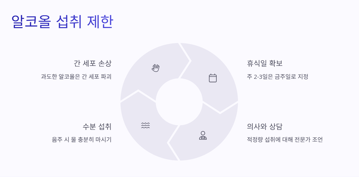 적정량의 알코올 섭취에 대해 의사와 상담하고, 간 질환이 있다면 반드시 금주해야 합니다.