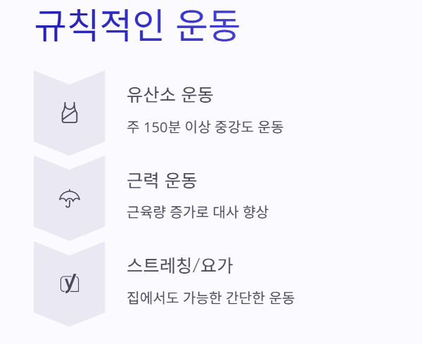 일주일에 최소 150분 이상의 중강도 유산소 운동(빠르게 걷기, 조깅, 수영 등)을 하는 것이 좋습니다. 근력 운동을 병행하면 더욱 효과적입니다. 헬스장에 갈 시간이 없다면 집에서 간단한 스트레칭이나 요가를 하는 것도 좋은 방법입니다.