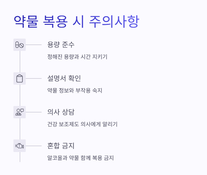 약물 복용 시 정해진 용량을 지키고, 임의로 약물을 혼합하거나 과다 복용하지 마세요. 처방전 없이 살 수 있는 약, 건강 보조제 복용 시에도 의사에게 알리고, 알코올과 약물을 함께 복용하지 마세요.
