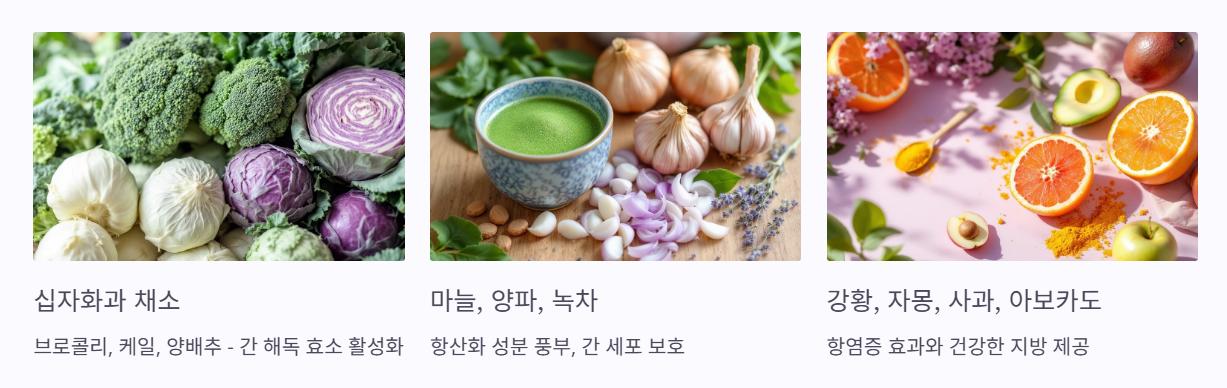 - 마늘, 양파: 항산화 성분이 풍부하여 간 세포를 보호합니다.