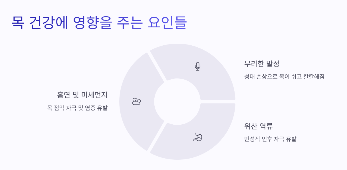 - 금연: 담배 연기는 목 점막을 자극하므로 금연하는 것이 좋습니다.