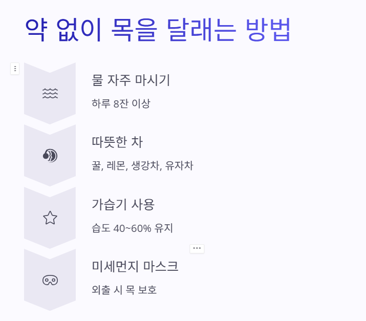 - 물 자주 마시기: 목 점막을 촉촉하게 유지하는 가장 기본적인 방법입니다. 하루 8잔 이상 충분히 물을 마시는 것이 좋습니다.