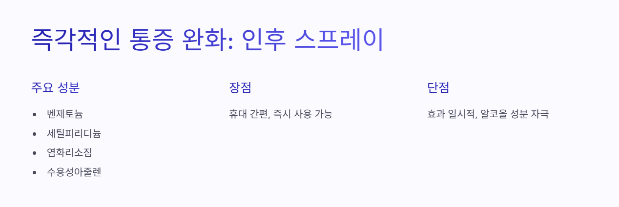 목 통증이 심하고 즉각적인 완화가 필요할 때는 인후 스프레이가 효과적입니다. 스프레이 형태이기 때문에 목 점막에 직접적으로 약물을 분사하여 빠르게 통증을 줄여줍니다.