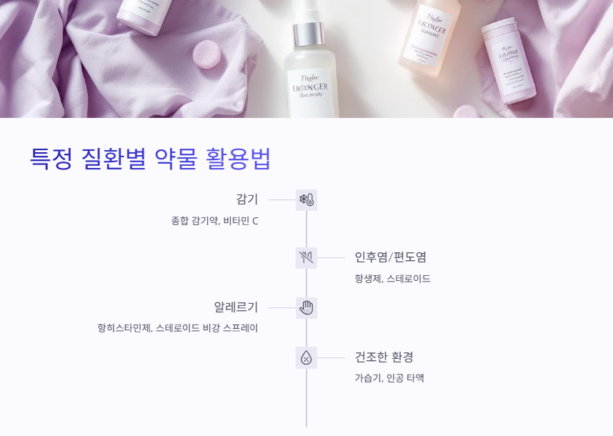 목의 칼칼함이 단순한 증상이 아닌, 특정 질환이나 상태와 관련된 경우, 그에 맞는 약물을 사용하는 것이 중요합니다.