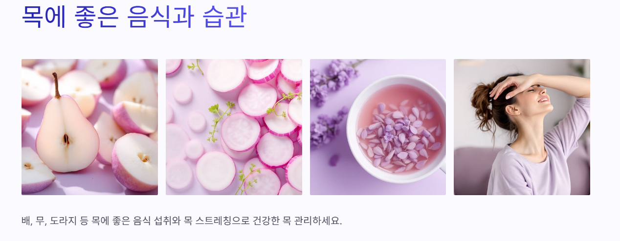 - 목에 좋은 음식 섭취: 배, 무, 도라지 등은 목에 좋은 음식으로 알려져 있습니다. 꾸준히 섭취하면 목 건강에 도움이 됩니다.