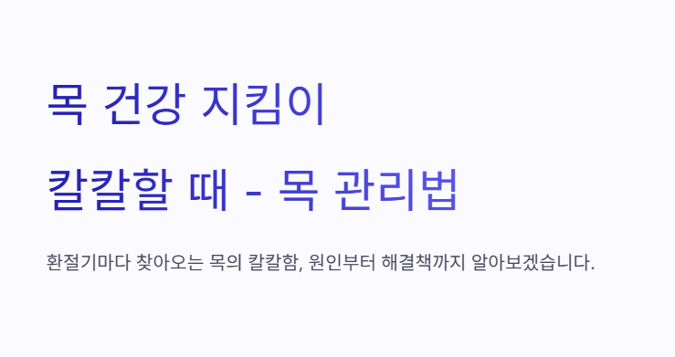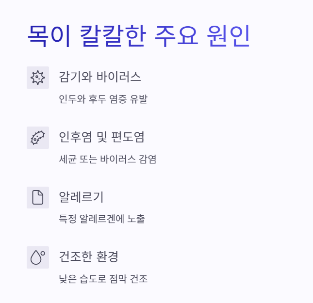 - 건조한 환경: 겨울철이나 에어컨 사용으로 실내 습도가 낮아지면 목 점막이 건조해져 칼칼함을 느낄 수 있습니다.
