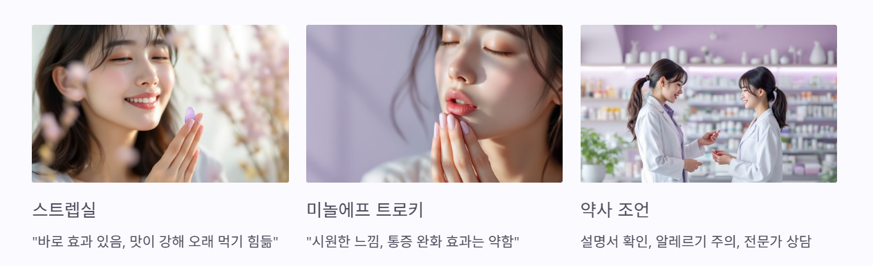 - 제품 예시: 스트렙실, 미놀에프 트로키, 모겐쿨 트로키